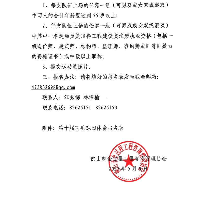 佛山市全過程工程咨詢管理協會關于舉辦第十屆羽毛球團體賽的報名通知