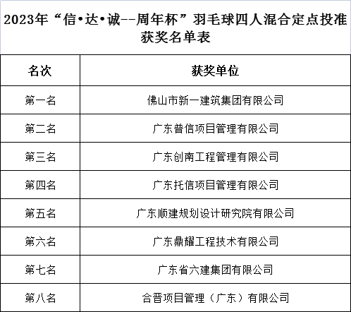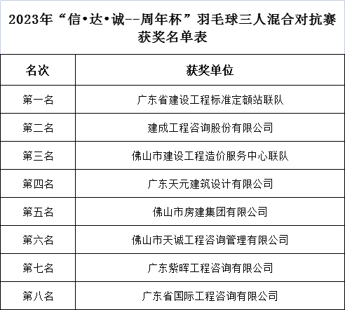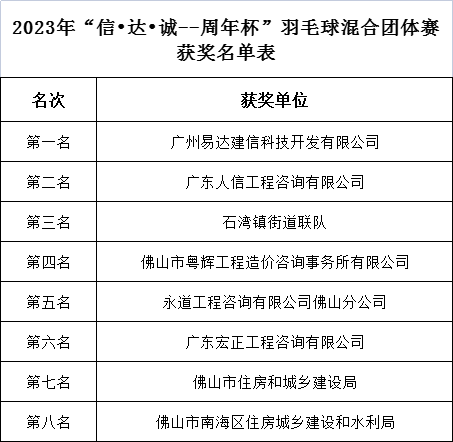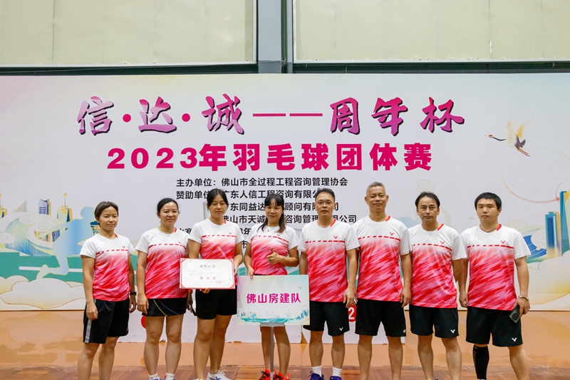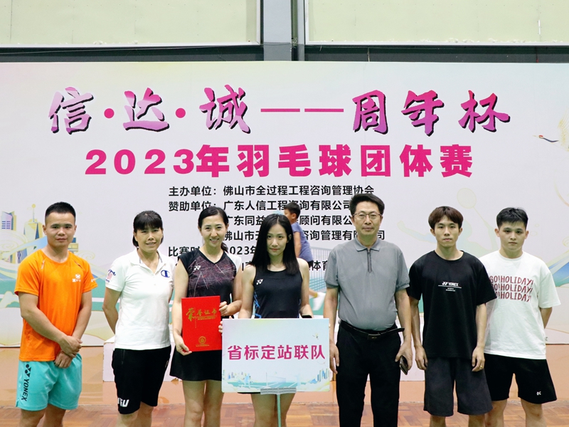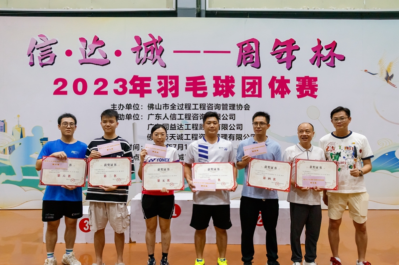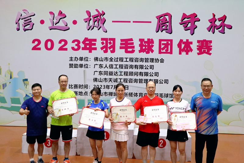 2023年“信?達?誠--周年杯”羽毛球團體賽至此圓滿落幕。在此特別鳴謝廣東人信工程咨詢有限公司、廣東同益達工程顧問有限公司、佛山市天誠工程咨詢管理有限公司三家公司的鼎力支持,同時感謝所有參賽選手和工作人員積極參與,期待一下屆的“展誠杯”再相聚。