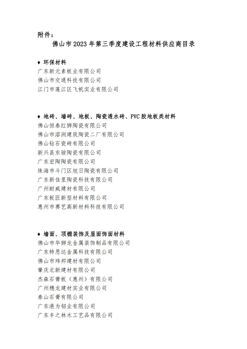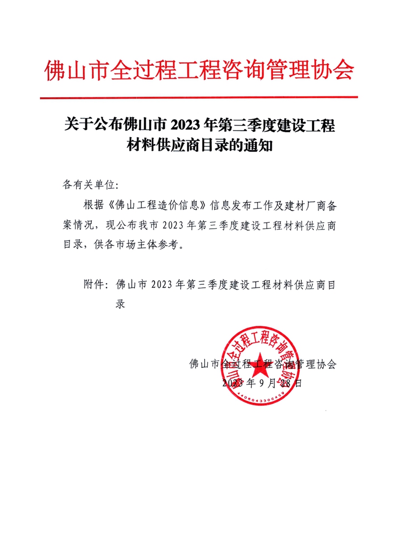 關于公布佛山市2023年第三季度建設工程材料供應商目錄的通知