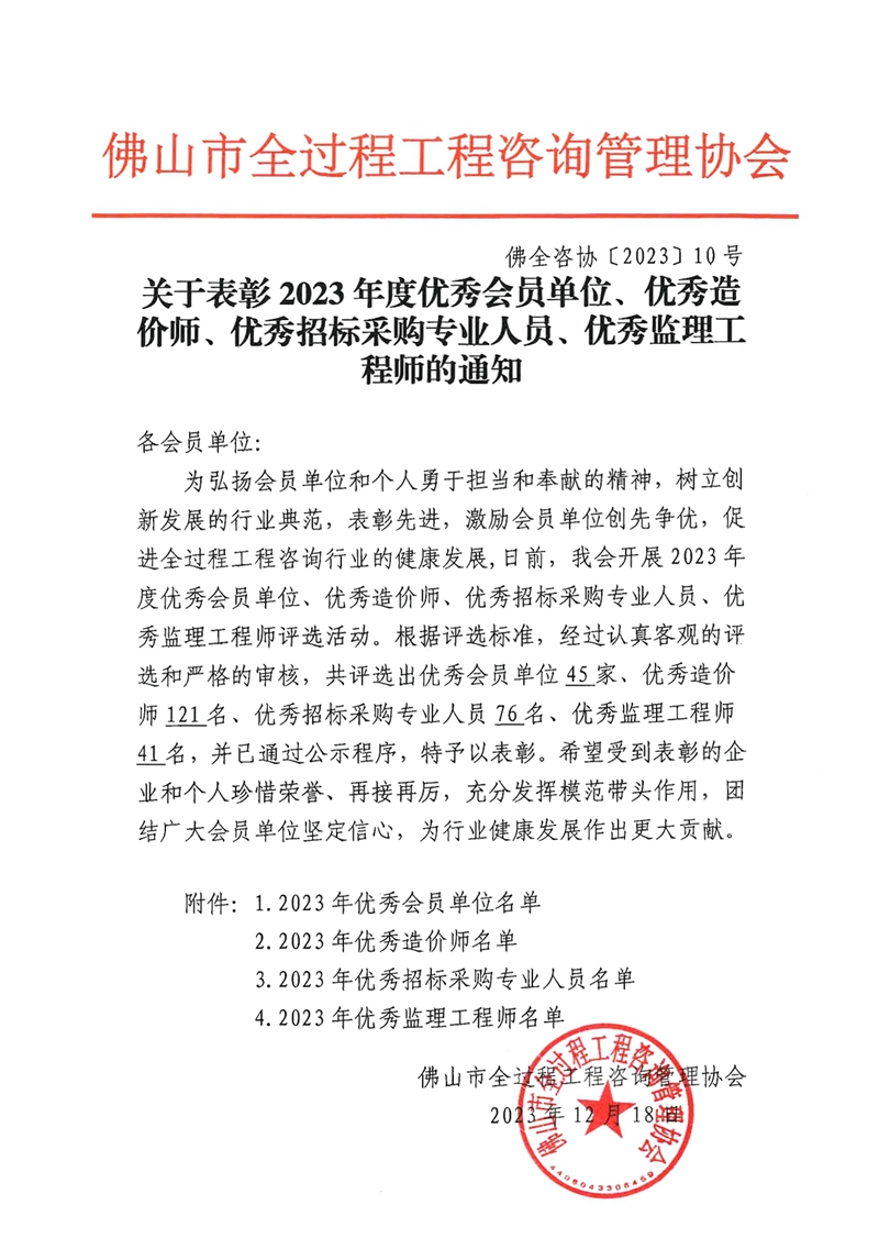 關于表彰2023年度優秀會員單位、優秀造價師、優秀招標采購專業人員、優秀監理工程師的通知