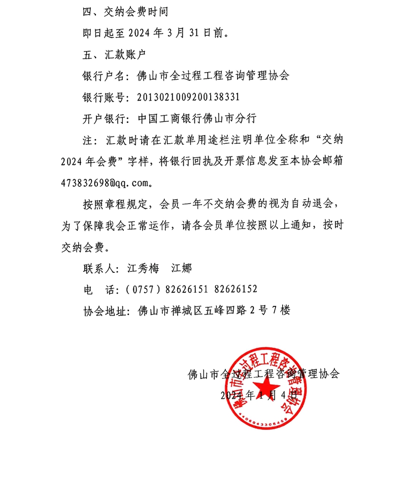 關于交納佛山市全過程工程咨詢管理協會2024年度會費的通知