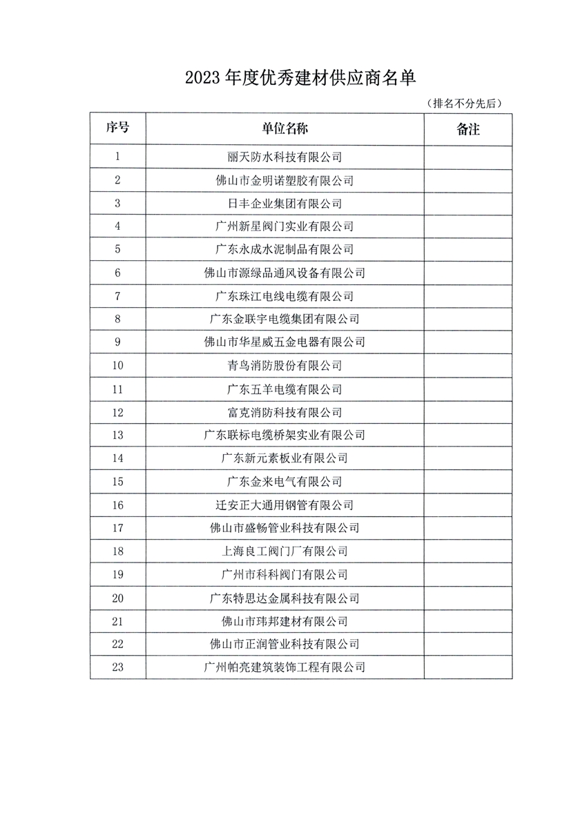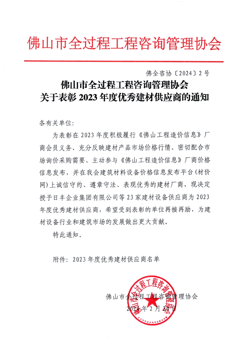 佛山市全過程工程咨詢管理協會關于表彰2023年度優秀建材供應商的通知
