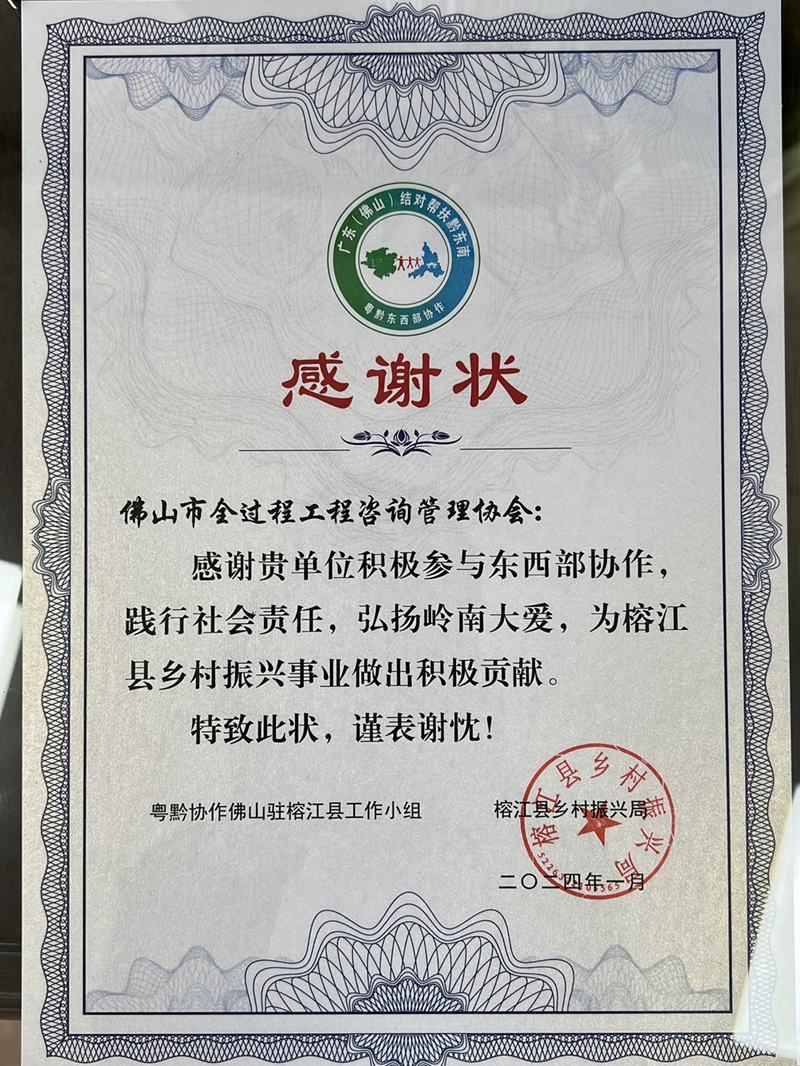 榕江縣鄉村振興局向佛山市全過程工程咨詢管理協會發來感謝狀