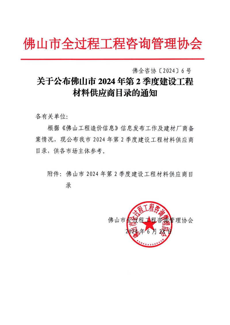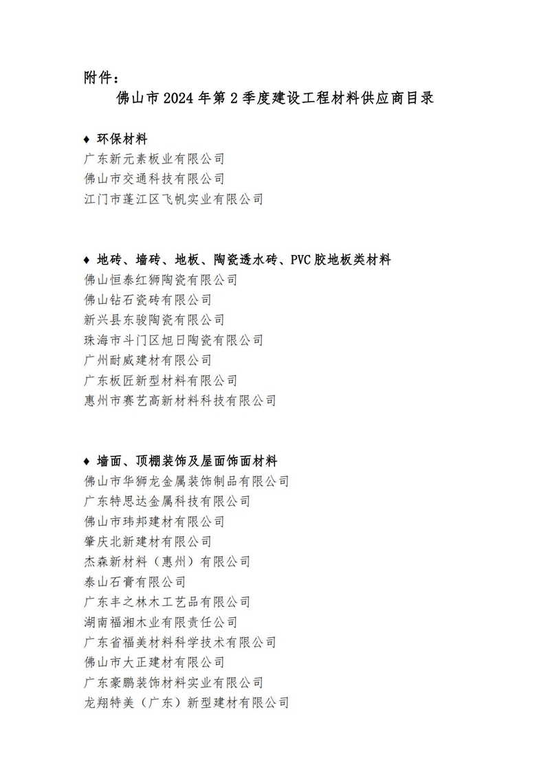 關(guān)于公布佛山市2024年第2季度建設(shè)工程材料供應(yīng)商目錄的通知
