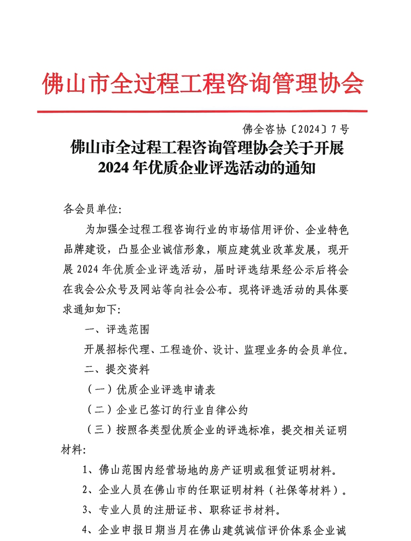 佛山市全過程工程咨詢管理協會關于開展2024年優質企業評選活動的通知