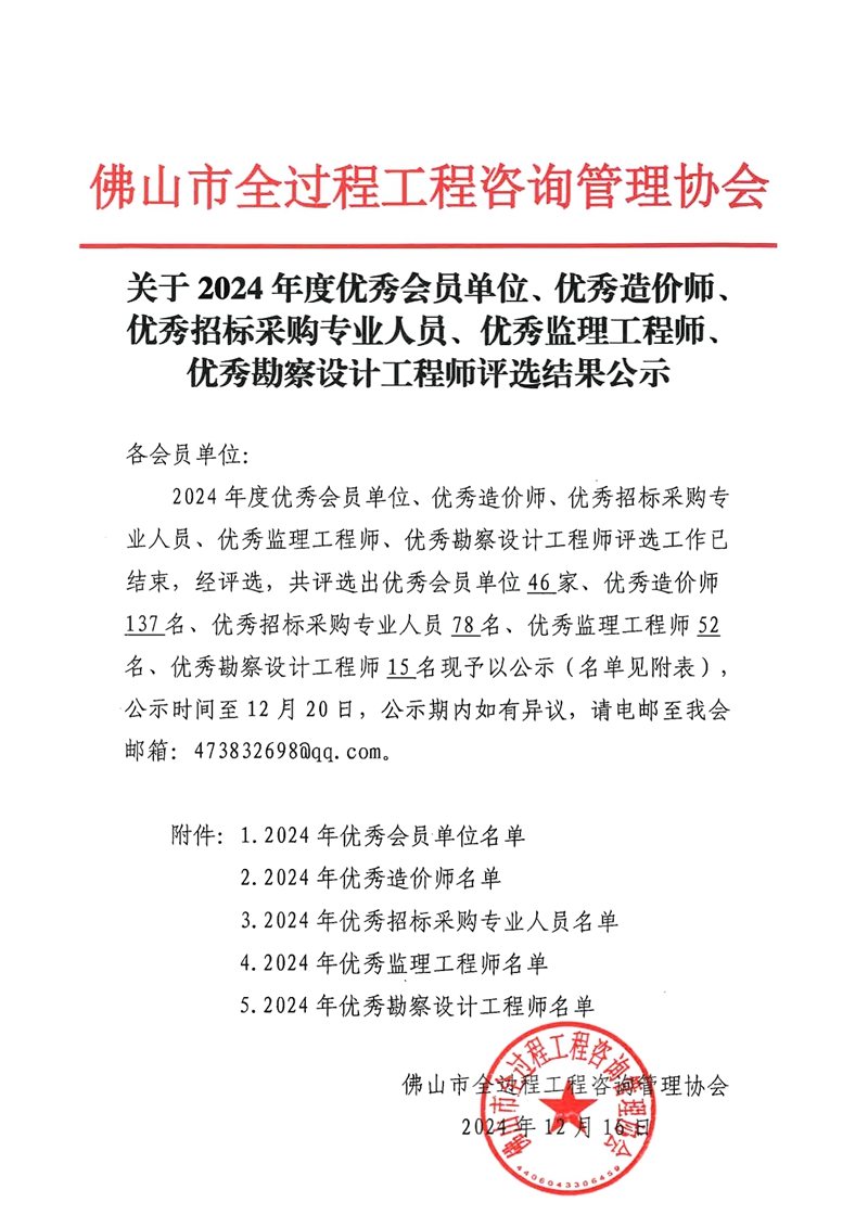 關于2024年度優秀會員單位、優秀造價師、優秀招標采購專業人員、優秀監理工程師、優秀勘察設計工程師評選結果公示