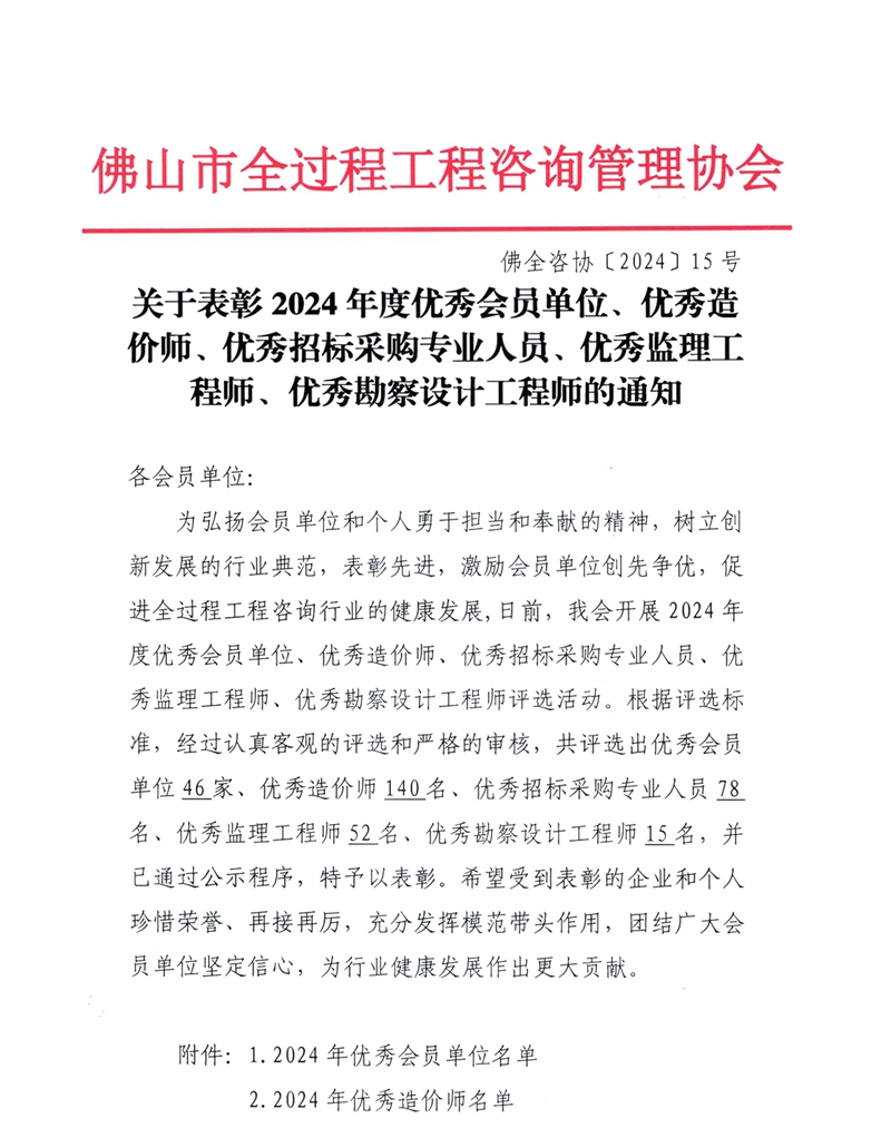 關于表彰2024年度優(yōu)秀會員單位、優(yōu)秀造價師、優(yōu)秀招標采購專業(yè)人員、優(yōu)秀監(jiān)理工程師、優(yōu)秀勘察設計工程師的通知