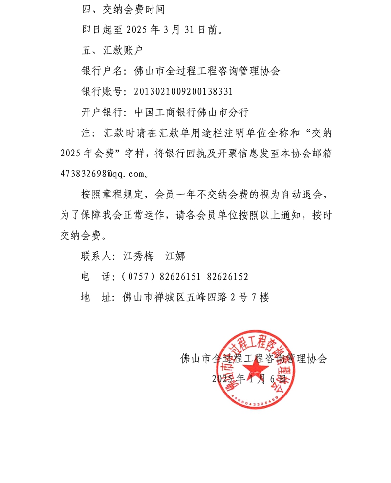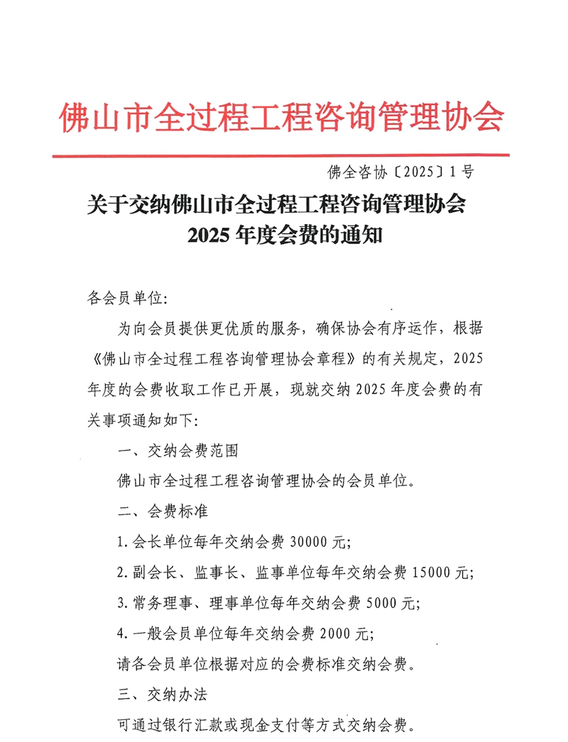 關于交納佛山市全過程工程咨詢管理協會2025年度會費的通知