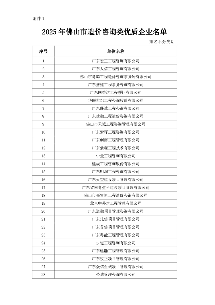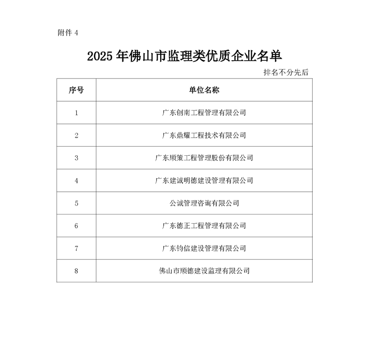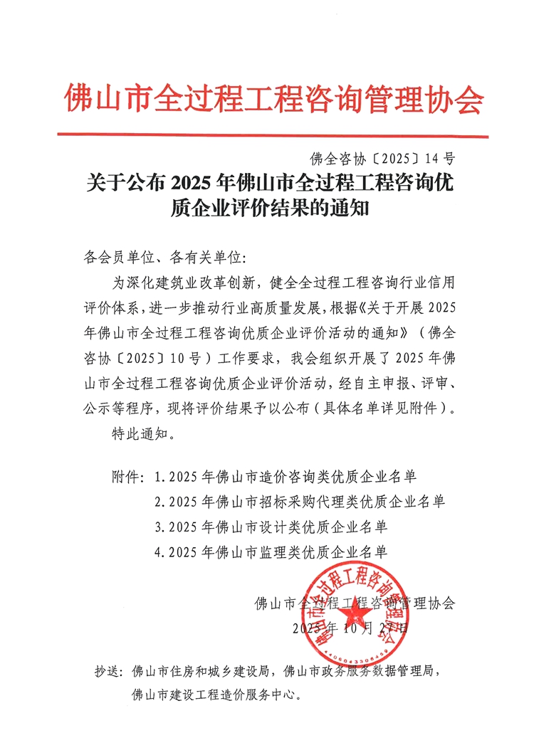 關(guān)于公布2025年佛山市全過程工程咨詢優(yōu)質(zhì)企業(yè)評(píng)價(jià)結(jié)果的通知