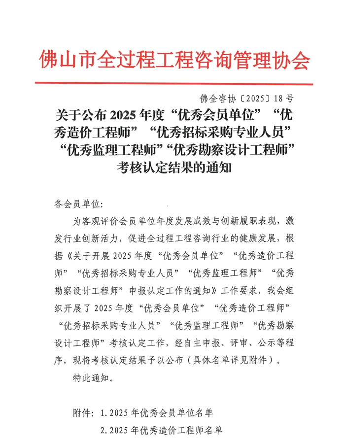 關(guān)于公布2025年度“優(yōu)秀會員單位”“優(yōu)秀造價工程師”“優(yōu)秀招標(biāo)采購專業(yè)人員”“優(yōu)秀監(jiān)理工程師”“優(yōu)秀勘察設(shè)計工程師”考核認(rèn)定結(jié)果的通知
