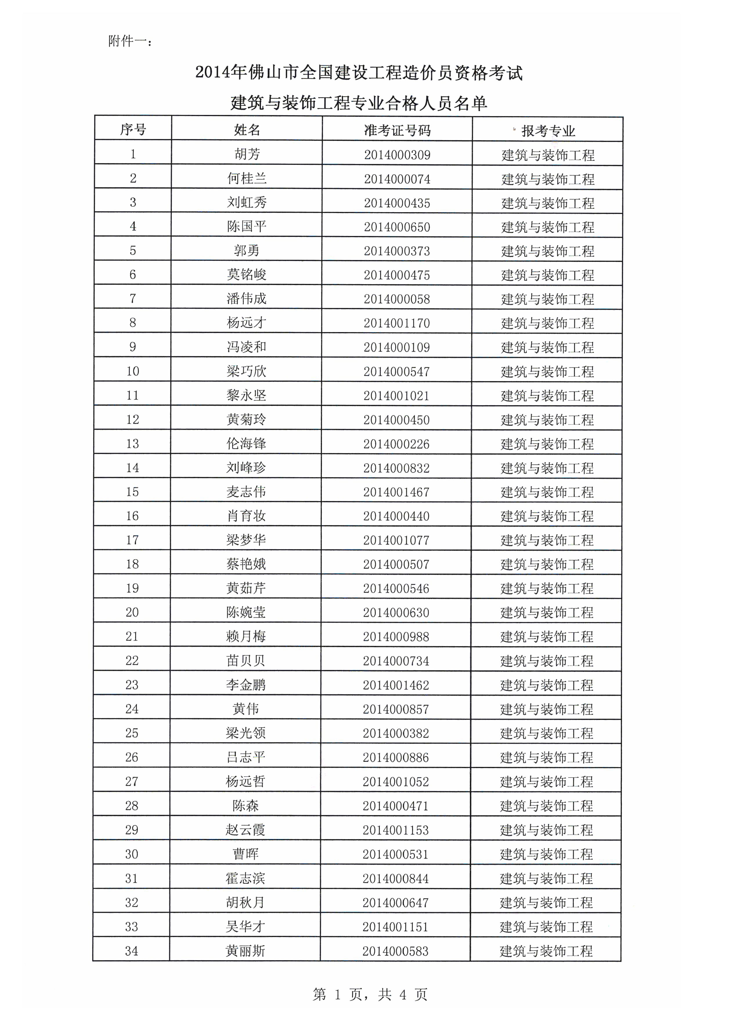關(guān)于公布2014年度佛山市全國建設(shè)工程造價員資格考試結(jié)果的函
