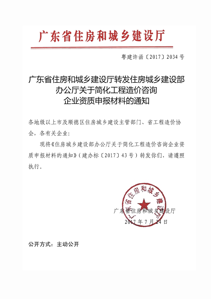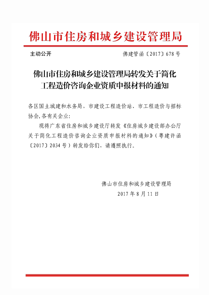 佛山市住房和城鄉(xiāng)建設管理局轉發(fā)關于簡化工程造價咨詢企業(yè)資質申報材料的通知