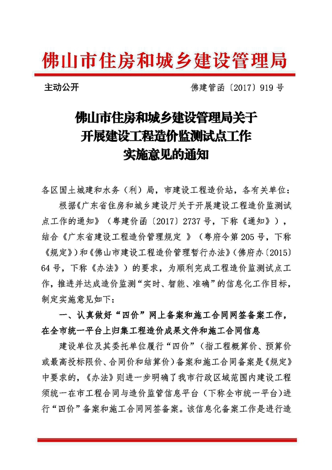 佛山市住房和城鄉建設管理局關于開展建設工程造價監測試點工作實施意見的通知