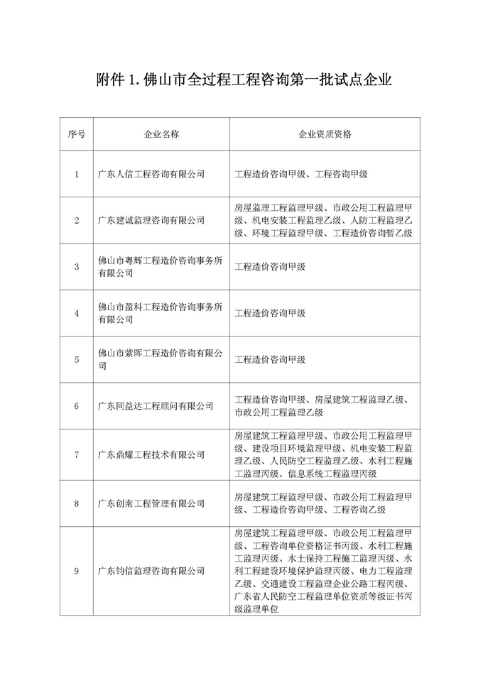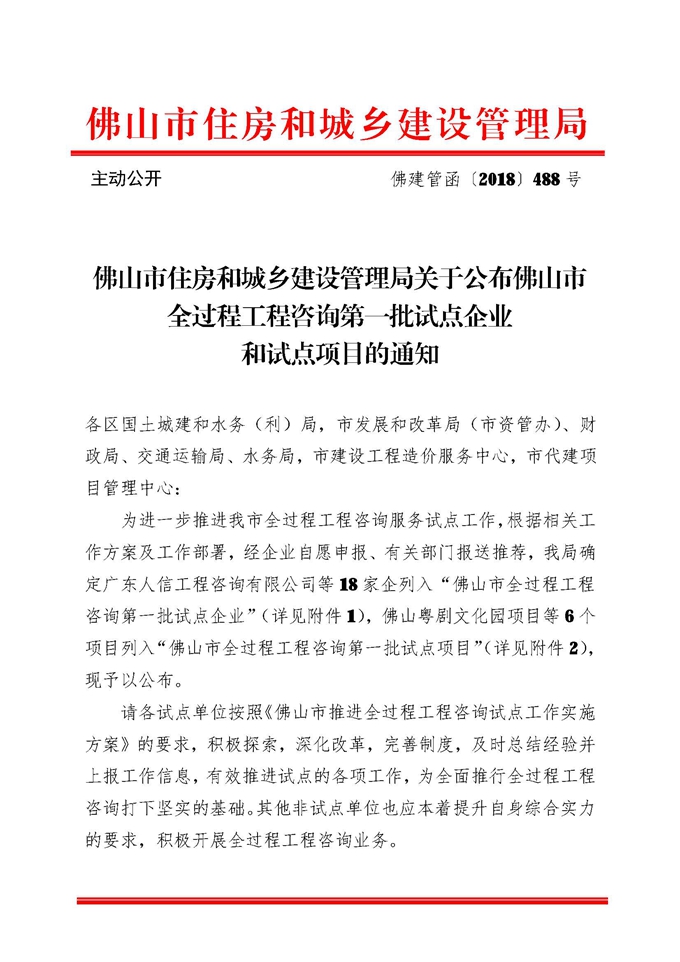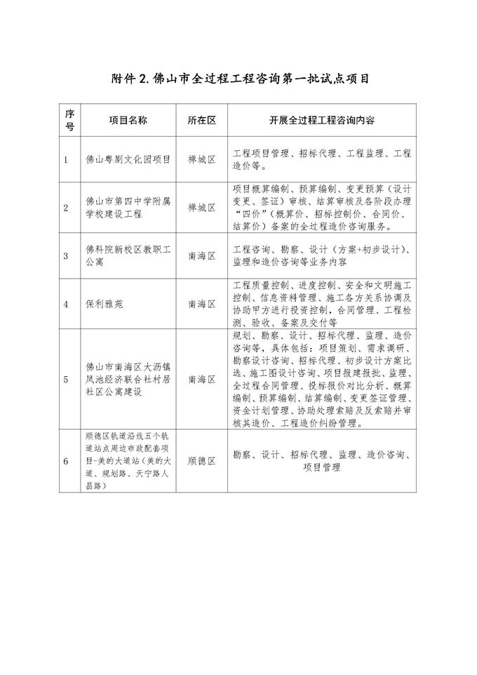 佛山市住房和城鄉建設管理局關于公布佛山市全過程工程咨詢第一批試點企業和試點項目的通知