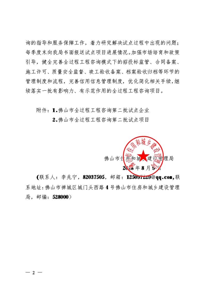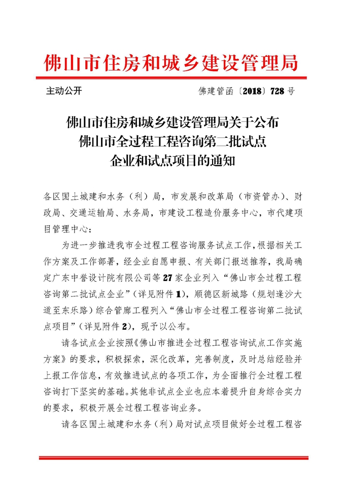 佛山市住房和城鄉(xiāng)建設(shè)管理局關(guān)于公布佛山市全過程工程咨詢第二批試點企業(yè)和試點項目的通知