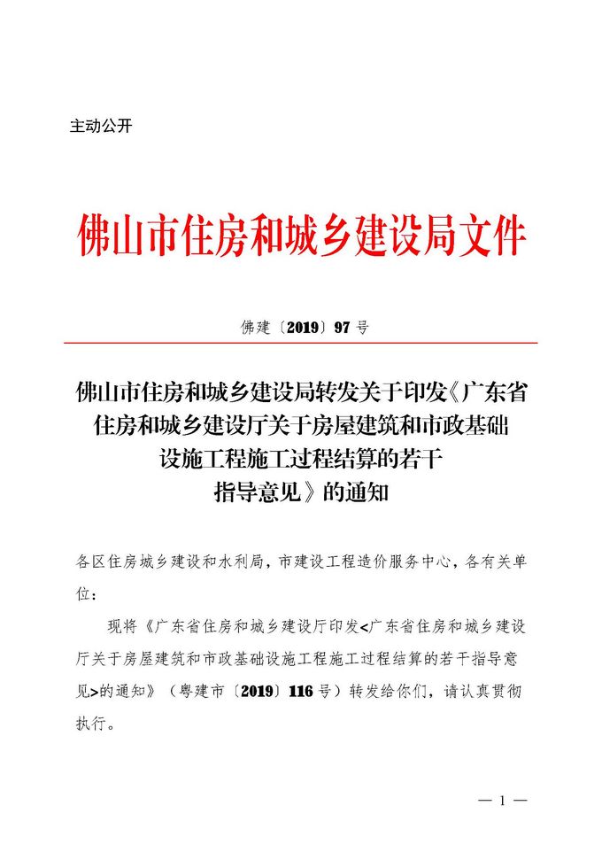 佛山市住房和城鄉建設局轉發關于印發《廣東省住房和城鄉建設廳關于房屋建筑和市政基礎設施工程施工過程結算的若干指導意見》的通知