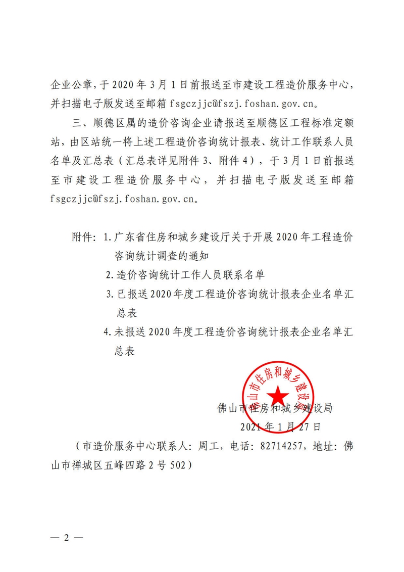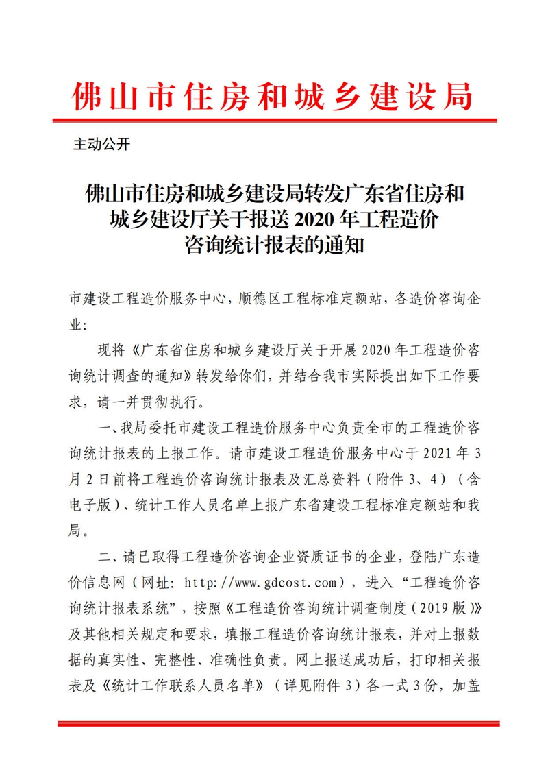 佛山市住房和城鄉建設局轉發廣東省住房和城鄉建設廳關于報送2020年工程造價咨詢統計報表的通知