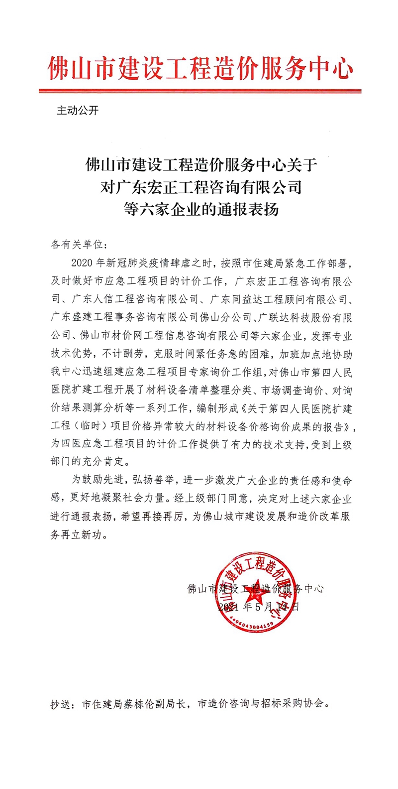 佛山市建設工程造價服務中心關于對廣東宏正工程咨詢有限公司等六家企業的通報表揚