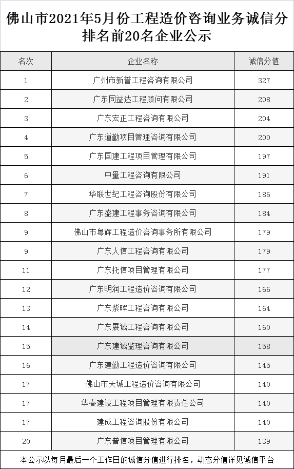 佛山市2021年5月份工程造價咨詢業務誠信分排名前20名企業公示