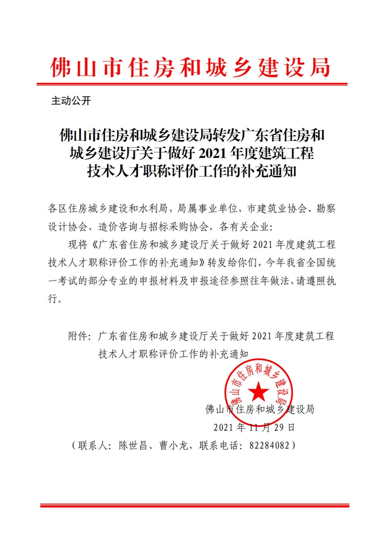 佛山市住房和城鄉建設局轉發廣東省住房和城鄉建設廳關于做好2021年度建筑工程技術人才職稱評價工作的補充通知