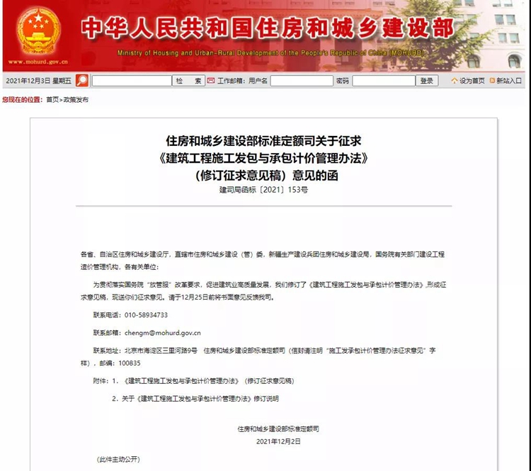 為貫徹落實國務院“放管服”改革要求,促進建筑業高質量發展,我們修訂了《建筑工程施工發包與承包計價管理辦法》,形成征求意見稿,現送你們征求意見。請于12月25日前將書面意見反饋我司。