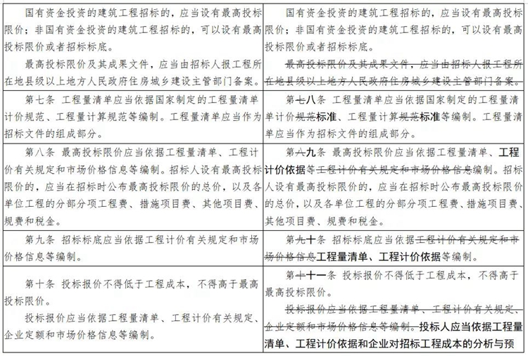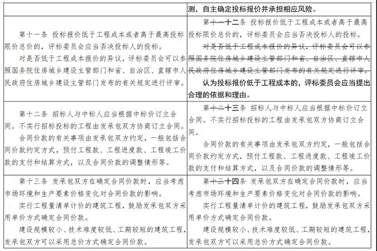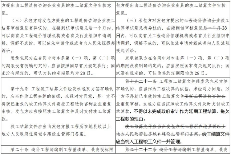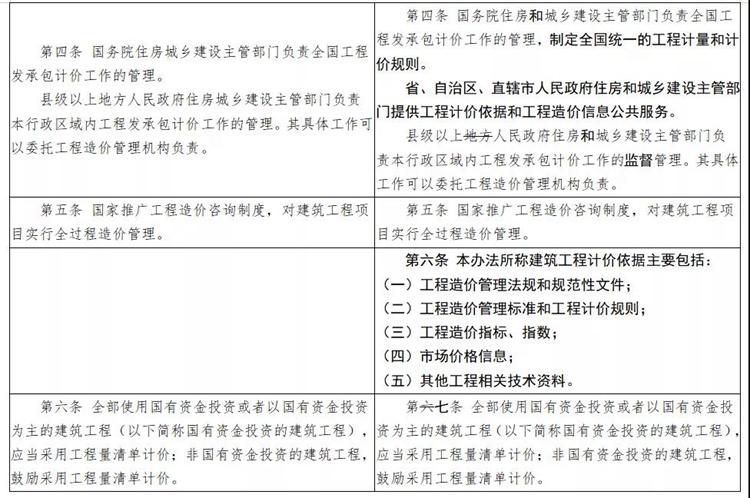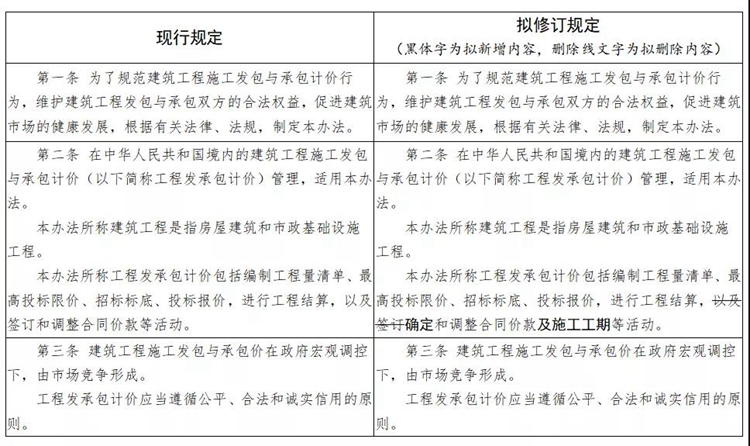 一是增加關于工期的條款。二是刪除原辦法中有關工程造價鑒定內容。三是規范文字表述。將“住房城鄉建設主管部門”統一修改為“住房和城鄉建設主管部門”;將“縣級以上地方人民政府”統一修改為“縣級以上人民政府”;將“工程計價有關規定和市場價格信息”統一修改為“工程計價依據”。