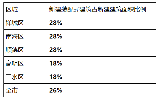 二、切實完成裝配式建筑年度任務指標。根據佛山市裝配式建筑專項規劃,2022年我市要確保完成新建裝配式建筑占新建建筑面積26%以上的目標任務,2022年佛山市各區裝配式建筑指標要求如下表: