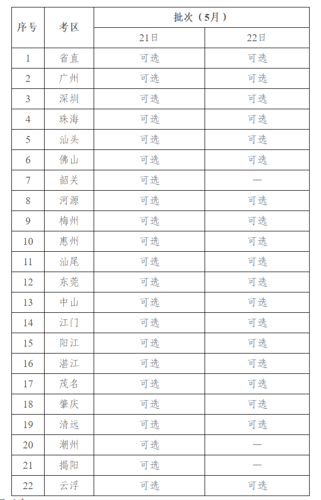 5月21、22日每日安排1個批次,共2個批次。各考區的批次安排不同,具體詳見附件2。