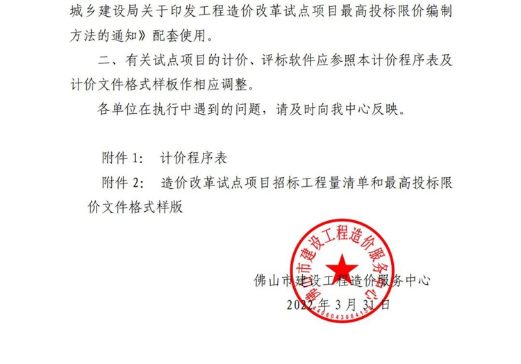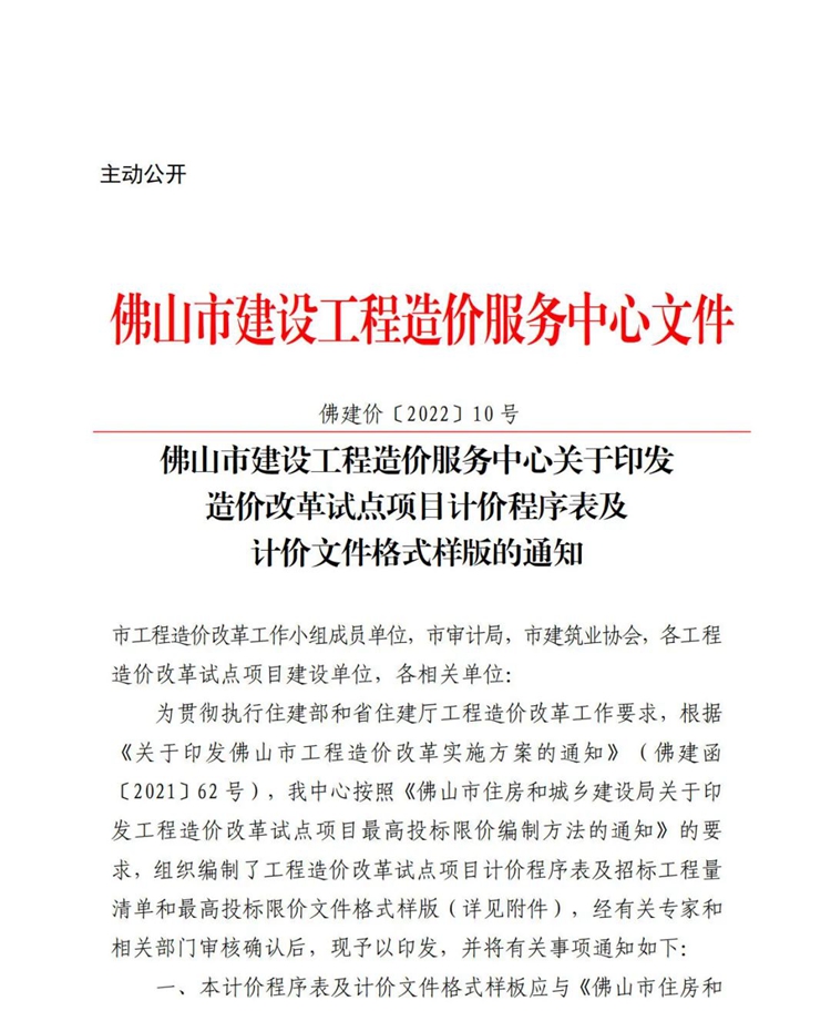 佛山市建設工程造價服務中心關于印發(fā)造價改革試點項目計價程序表及計價文件格式樣版的通知
