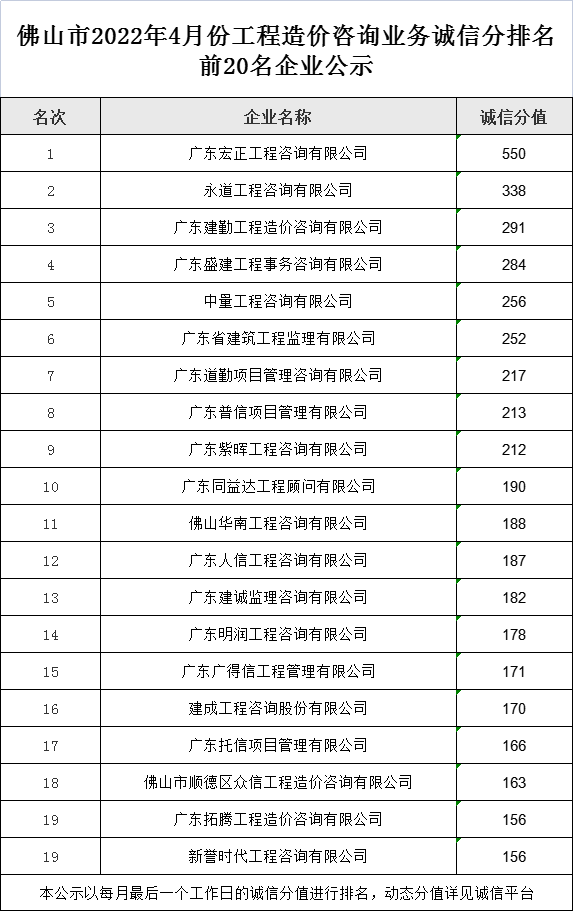 佛山市2022年4月份工程造價(jià)咨詢業(yè)務(wù)誠信分排名前20名企業(yè)公示
