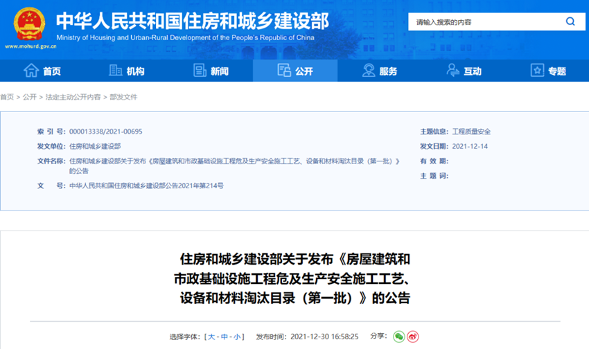 2021年12月14日,住建部印發的《房屋建筑和市政基礎設施工程危及生產安全施工工藝、設備和材料淘汰目錄(第一批)》明確: