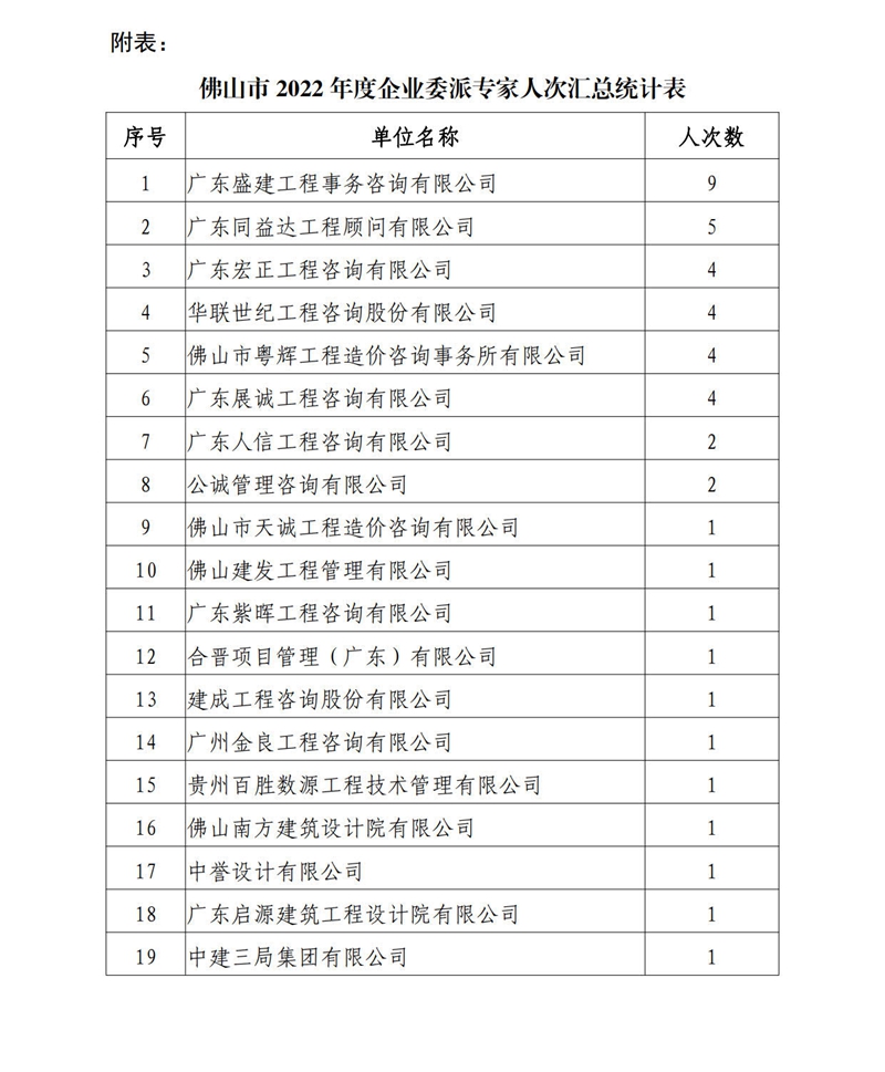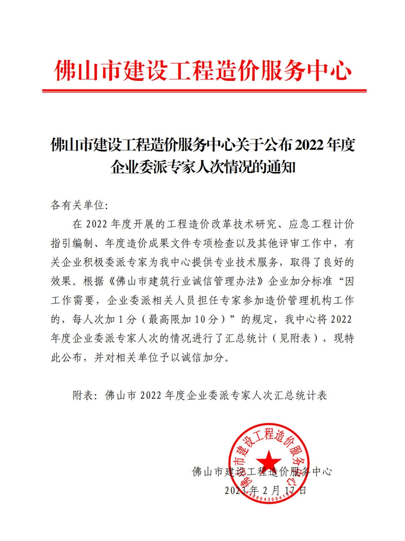 轉發(fā) | 佛山市建設工程造價服務中心關于公布2022年度企業(yè)委派專家人次情況的通知