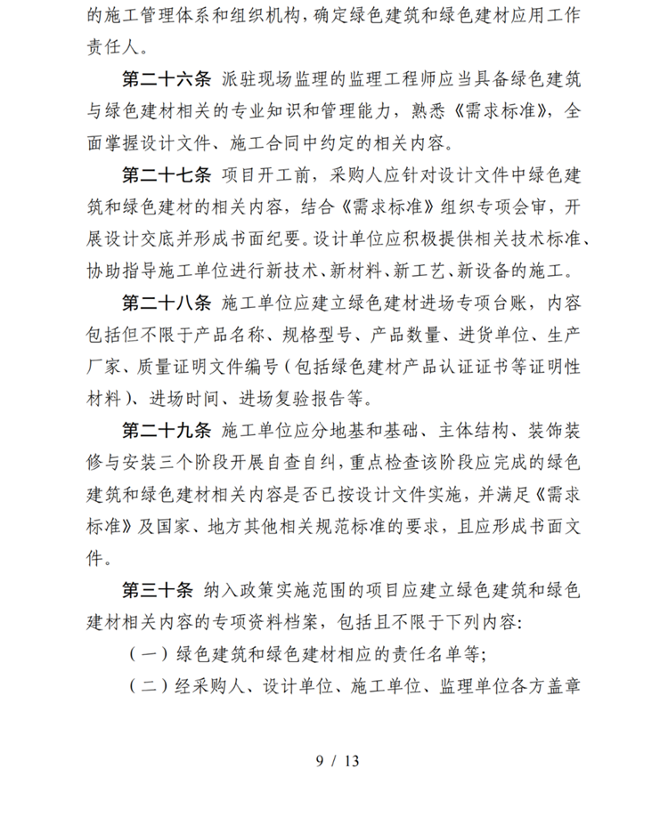 《指南》明確,施工單位應嚴格按照設計文件和《綠色建筑和綠色建材政府采購需求標準》(以下簡稱《需求標準》)的規定以及相關建設工程標準進行施工。同時,應建立相應的施工管理體系和組織機構,確定綠色建筑和綠色建材應用工作責任人。