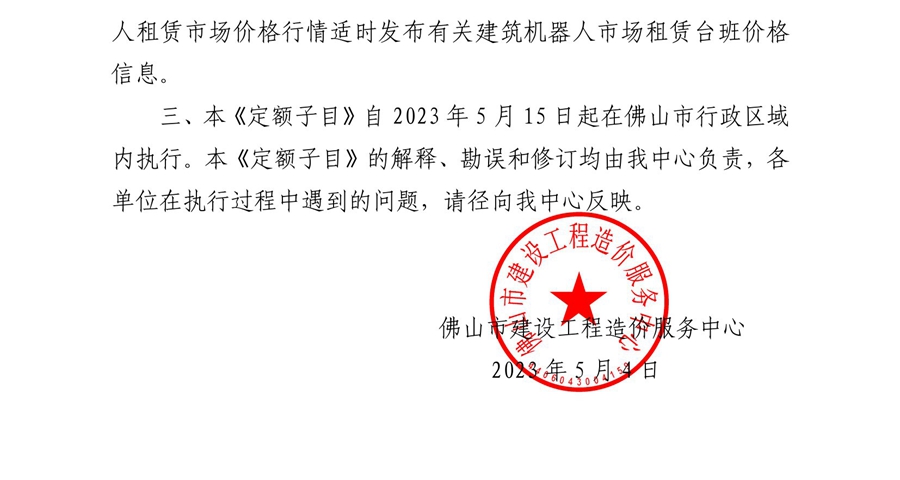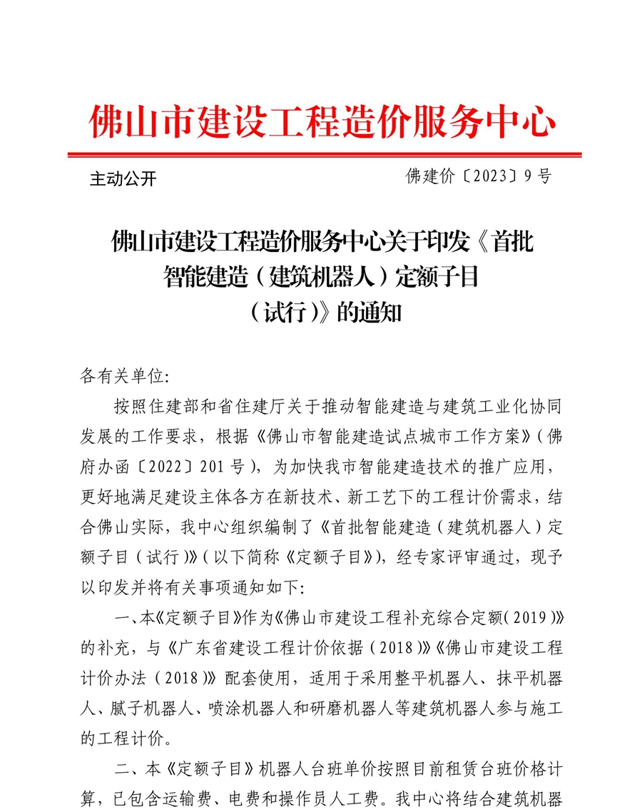 佛山市建設工程造價服務中心關于印發《首批智能建造(建筑機器人)定額子目(試行)》的通知