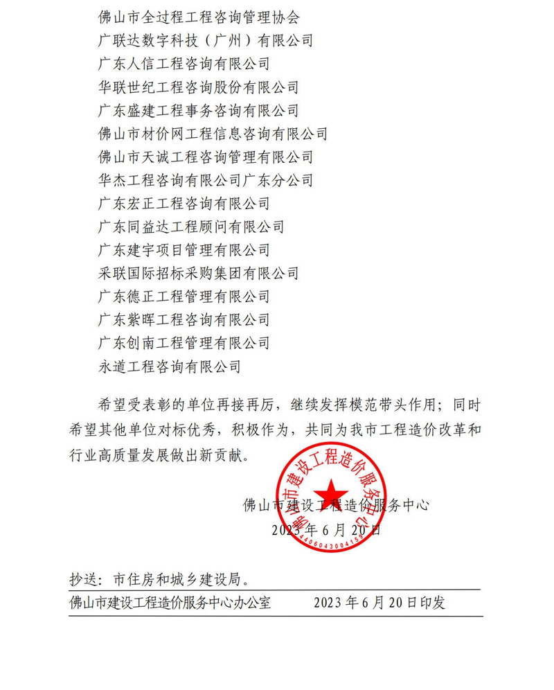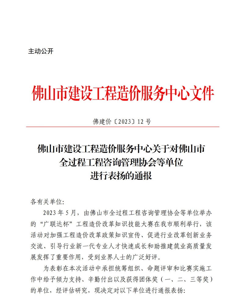 佛山市建設工程造價服務中心關于對佛山市全過程工程咨詢管理協會等單位進行表揚的通報