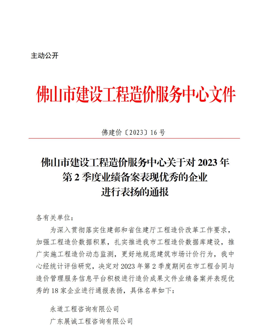 佛山市建設(shè)工程造價(jià)服務(wù)中心關(guān)于對(duì)2023年第2季度業(yè)績(jī)備案表現(xiàn)優(yōu)秀的企業(yè)進(jìn)行表?yè)P(yáng)的通報(bào)