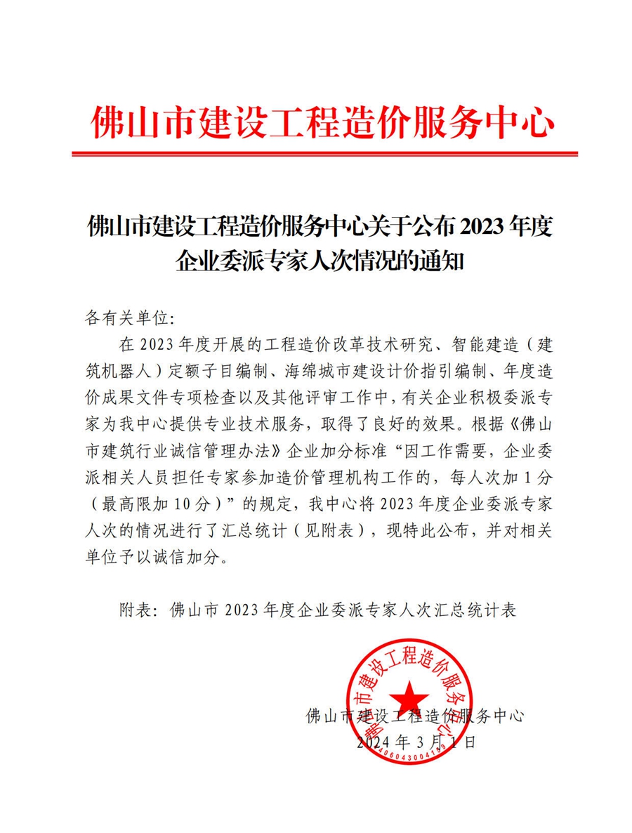 轉(zhuǎn)發(fā) | 佛山市建設(shè)工程造價(jià)服務(wù)中心關(guān)于公布2023年度企業(yè)委派專(zhuān)家人次情況的通知