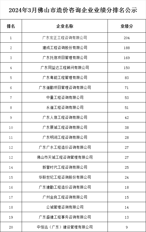 轉發 | 2024年3月佛山市造價咨詢企業業績分排名公示