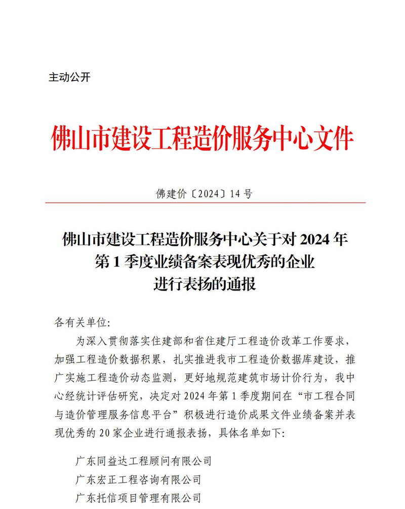 轉(zhuǎn)發(fā) | 佛山市建設(shè)工程造價服務中心關(guān)于對2024年第1季度業(yè)績備案表現(xiàn)優(yōu)秀的企業(yè)進行表揚的通報