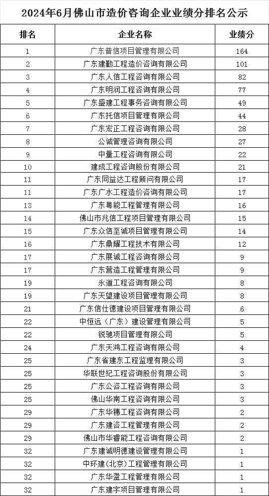 轉發 | 2024年6月佛山市造價咨詢企業業績分排名公示