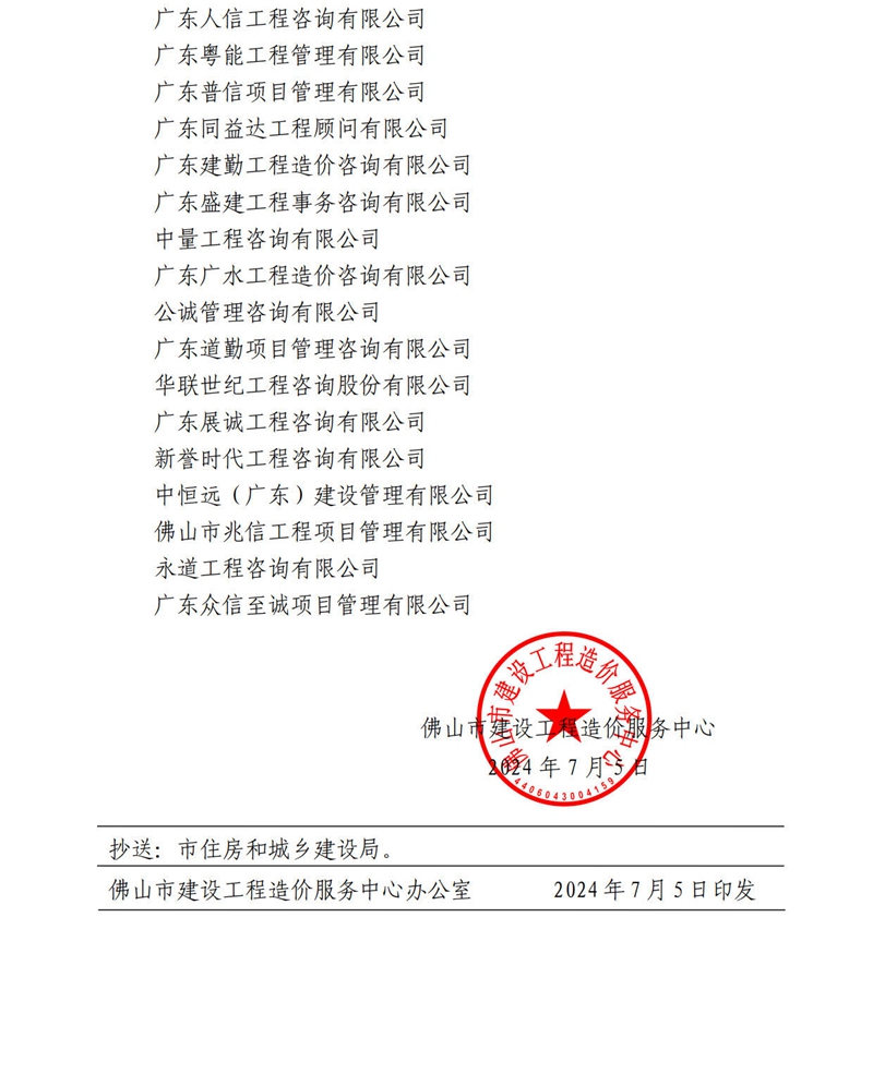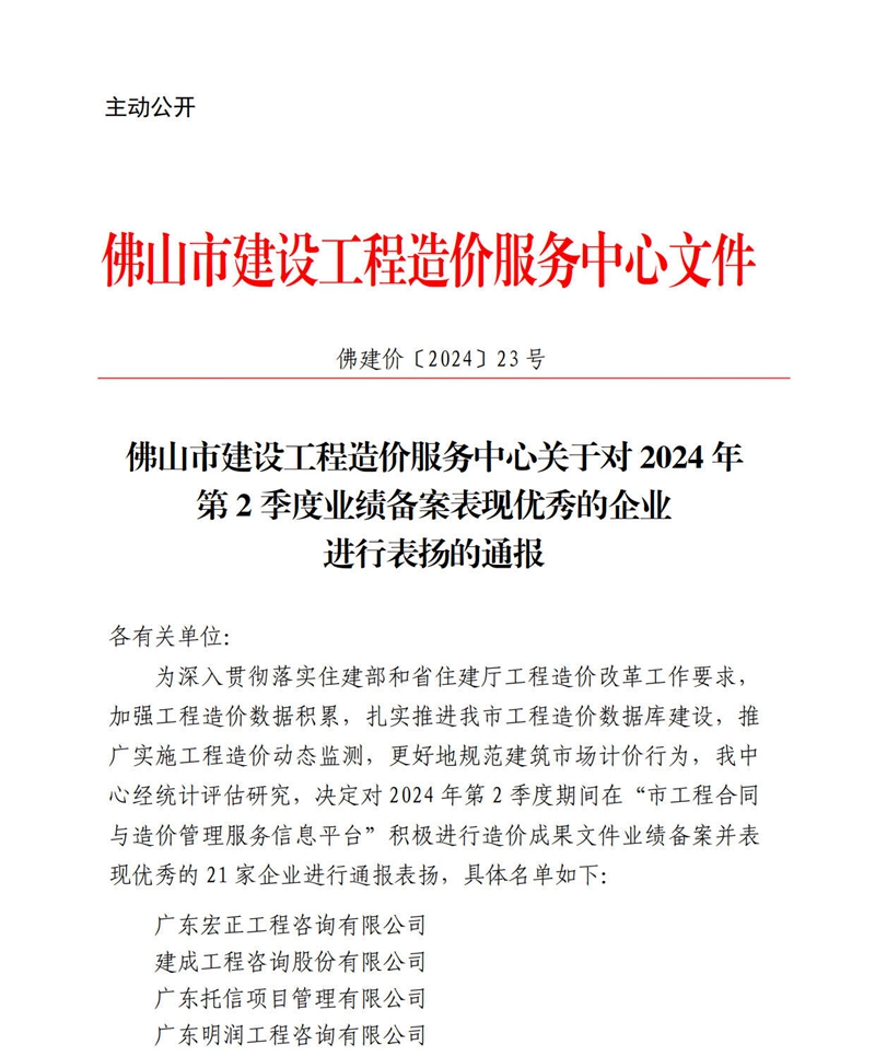 轉發 | 佛山市建設工程造價服務中心關于對2024年第2季度業績備案表現優秀的企業進行表揚的通報