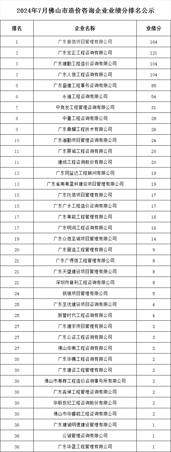 轉發 | 2024年7月佛山市造價咨詢企業業績分排名公示