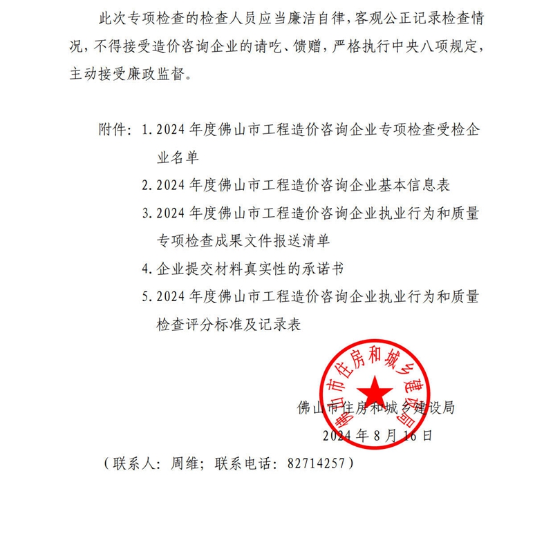 佛山市住房和城鄉建設局關于開展2024年度工程造價咨詢企業執業行為和質量專項檢查的通知