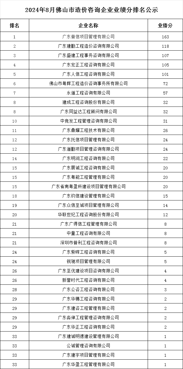 轉發 | 2024年8月佛山市造價咨詢企業業績分排名公示