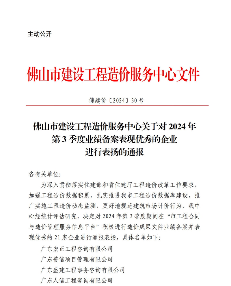 轉(zhuǎn)發(fā) | 佛山市建設(shè)工程造價(jià)服務(wù)中心關(guān)于對(duì)2024年第3季度業(yè)績(jī)備案表現(xiàn)優(yōu)秀的企業(yè)進(jìn)行表?yè)P(yáng)的通報(bào)