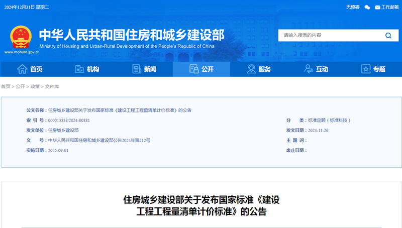 重磅!住建部發布國家標準2024版《建設工程工程量清單計價標準》,自2025年9月1日起實施!