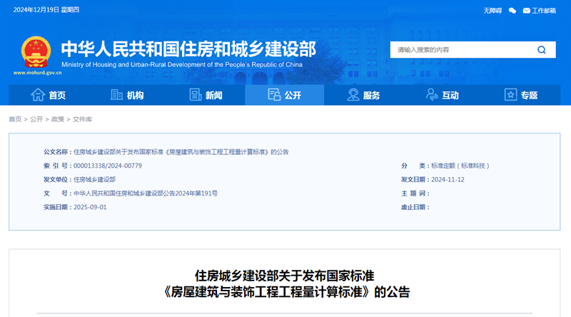2024年11月12日,住房和城鄉建設部批準《房屋建筑與裝飾工程工程量計算標準》等9項國家標準,自2025年9月1日起實施。原2013版《房屋建筑與裝飾工程工程量計算規范》等9項國家標準同時廢止。