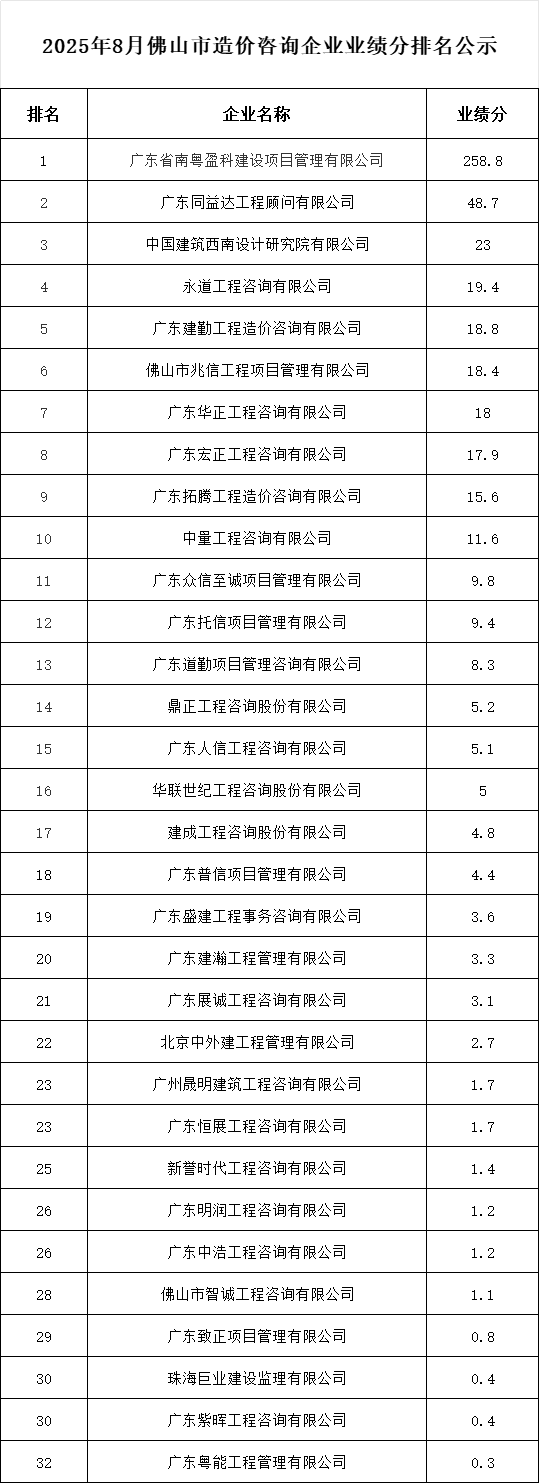 轉發 | 2025年8月佛山市造價咨詢企業業績分排名公示