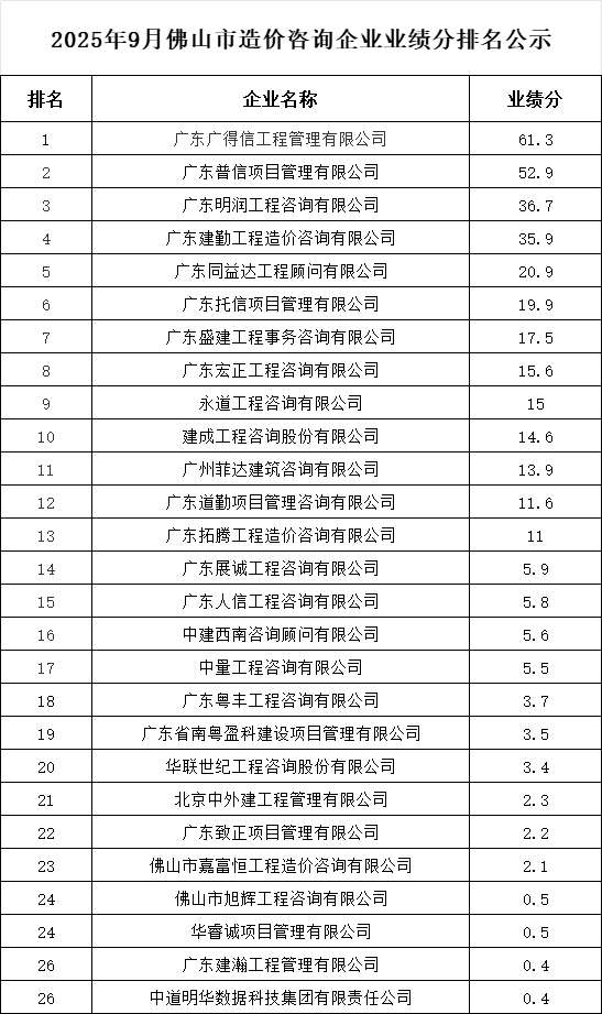 轉發 | 2025年9月佛山市造價咨詢企業業績分排名公示