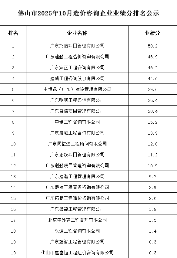 轉(zhuǎn)發(fā) | 佛山市2025年10月造價咨詢企業(yè)業(yè)績分排名公示